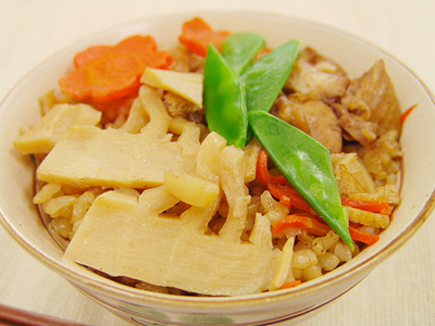 | ●作り方 <1> お釜に発芽玄米をあけ、醤油・酒・みりんを入れる。 調味料をいれ終わったら、3合のメモリまでだし汁を入れて混ぜる。 <2> 材料(鶏肉・油揚げ・にんじん・絹さや)をお釜に入れる。 ※ポイント・・・お米と具材を混ぜないようにする! <3> ふたをして炊飯をスタートさせる。 |